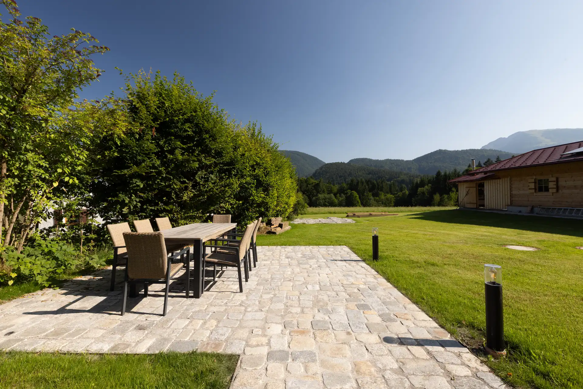 Ein sonniger Garten mit großzügigem Sitzplatz und einem Sonnendeck laden zum Verweilen, Essen und Spielen ein. Zum Süden geht der Garten nahtlos in saftige Wiesen über. Vom Steg des Sonnendecks schauen Sie auf das beeindruckende Gebirge des Wilden und Zahmen Kaisers.
