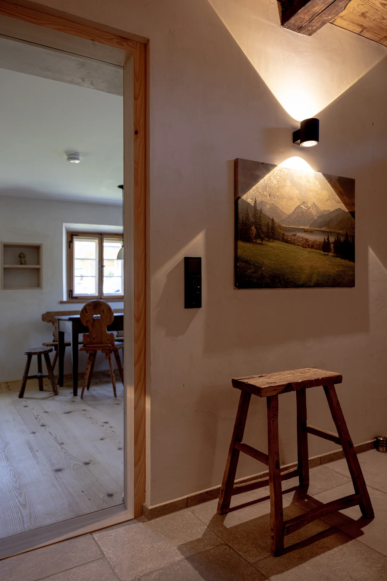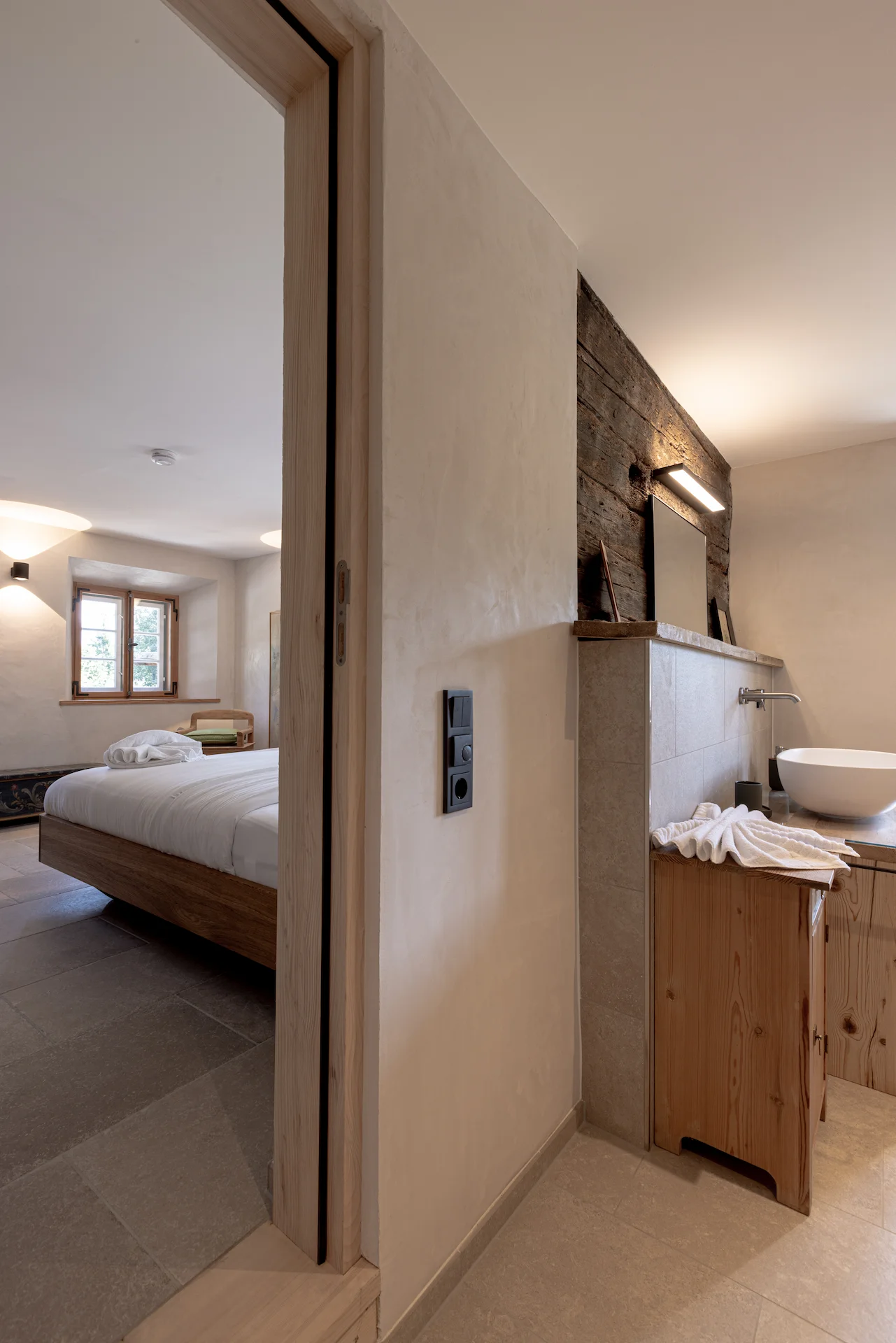 Freigelegte Blockwände, originale Holzdielen und liebevoll ausgewählte Details treffen auf klares, modernes Design. Es ist die seltene Verbindung aus historischer Bausubstanz und zeitgemäßem Komfort, die diesem Ort das Besondere verleihen.